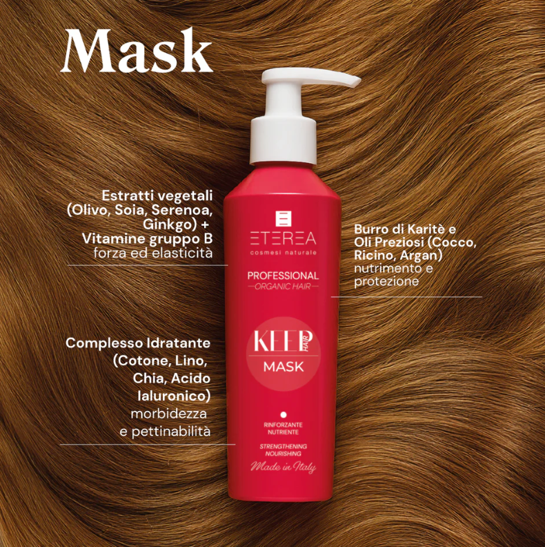 Maschera cremosa ad alta concentrazione di attivi naturali, ideale per nutrire, rinforzare e districare efficacemente la fibra capillare, prevenendo la rottura. Agisce in sinergia con due complessi esclusivi: un blend vegetale rinforzante, con Estratti di Olivo, Soia, Serenoa, Ginkgo e Vitamine del gruppo B, per capelli più forti, elastici e resistenti; e un complesso idratante e districante, a base di Cotone, Lino, Chia, Carragenina e Acido Ialuronico, che restituisce morbidezza, luminosità e pettinabilità. Arricchita con Burro di Karité, Oli di Cocco, Ricino e Argan, Squalano e Proteine Vegetali Idrolizzate, nutre in profondità, ripara e protegge, senza appesantire. Per capelli più sani, setosi e visibilmente più corposi fin dalla prima applicazione.