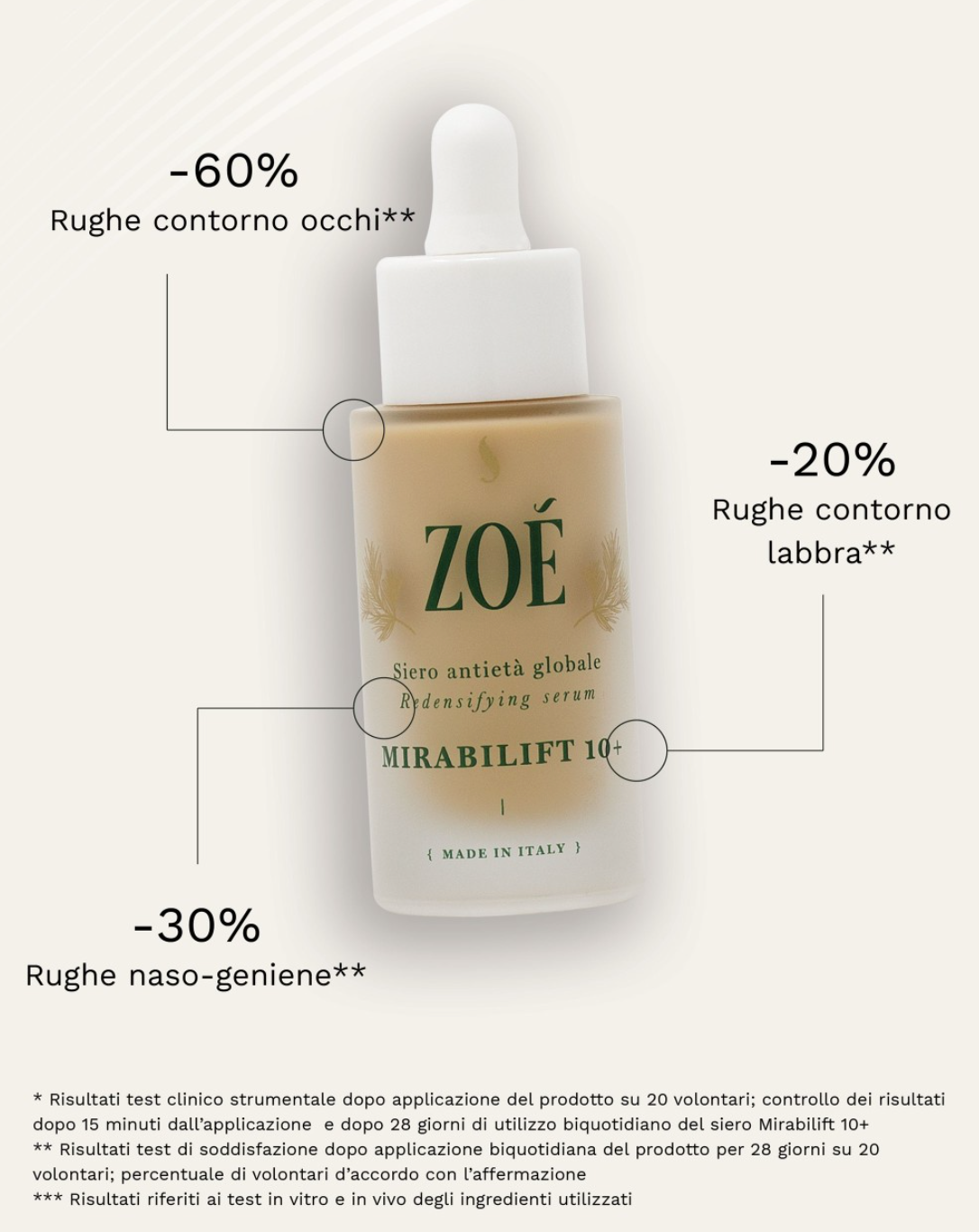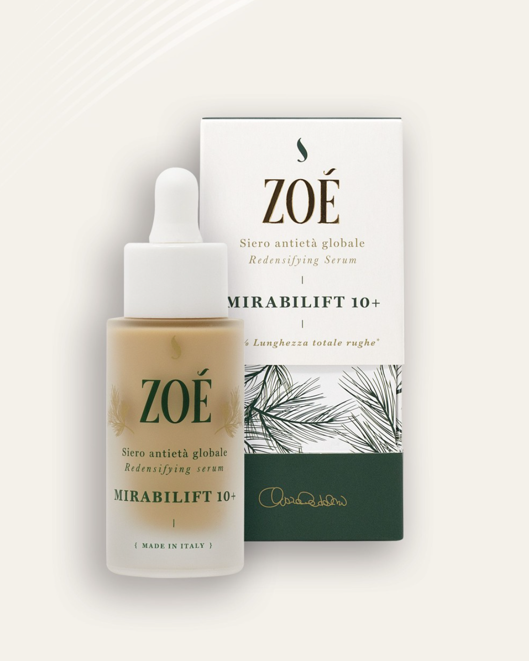 Mirabilift 10+ è un siero antietà intensivo formulato per offrire un effetto lifting istantaneo e profondo. Questo siero viso antiage esclusivo è potenziato con il 28% di attivi, tra cui Pycnogenol®, Centella Asiatica, Baobab, Pepe di Sichuan, Peptidi Botox-like, Acido Ialuronico a basso peso molecolare e Acido Lattobionico.