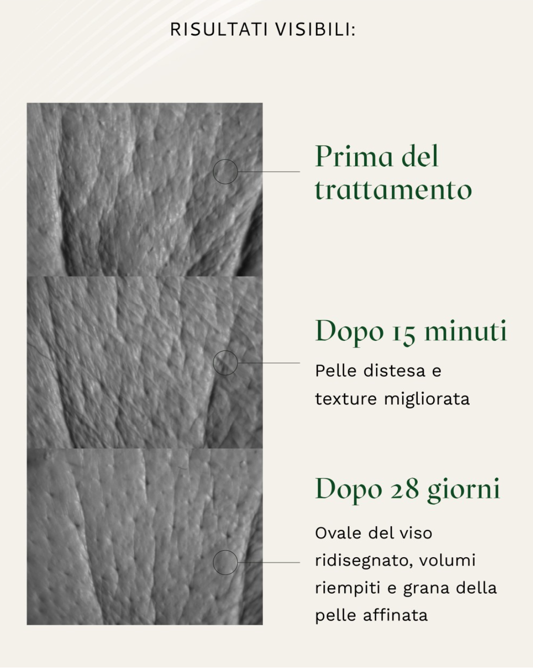 ✔️ Ovale del viso ridisegnato, volumi riempiti e grana della pelle affinata dopo 28 giorni.