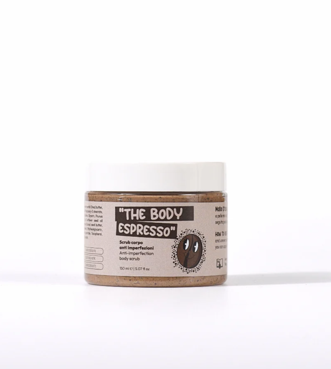Acqua, Burro di karitè, Caffè, Polyglyceryl-3 stearate (emulsionante), Caprylic/capric triglyceride (derivato del cocco), Cetearyl alcohol (emulsionante), Olio di mandorle dolci, Glicerina, Sunflower seed oil polyglyceryl-4 esters (derivato del girasole), Burro di cacao, Benzyl glycol (agente antibatterico), Aroma (ottenuto da materie prime food grade), Ethylhexylglycerin (conservante naturale), Lecithin (emulsionante), Raspberry ketone (derivato del lampone), Ascorbyl palmitate (antiossidante naturale), Caramel (composto aromatico), Ascorbyl palmitate (antiossidante naturale), Tocopherol (vitamina E), Helianthus annuus (Sunflower) seed oil (derivato del girasole), Vanillina.