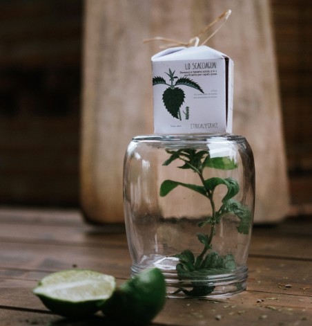 Con polvere di ortica, olio di ricino e di cocco, olio essenziale di menta e lime – ingredienti noti per le loro capacità di regolare la produzione di sebo e di combattere il prurito.